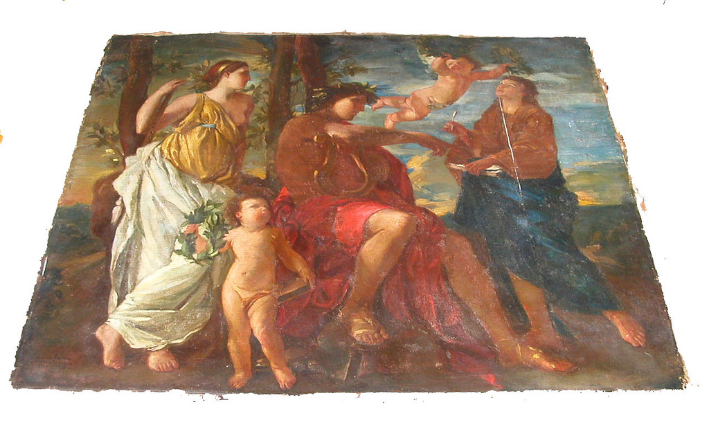 Esta obra corresponde a una copia en pequeño formato, del original de N.Poussin (siglo XVII ) realizada por el pintor chileno Laureano Guevara (1889-1968). Esta presentaba una reentela anterior con mala adherencia lo cual alteraba el plano del soporte. Fue necesario remover esta tela y realizar una limpieza por el reverso. Luego se consolidó un rasgado y se realizó la limpieza del anverso para eliminar el barniz amarillento.